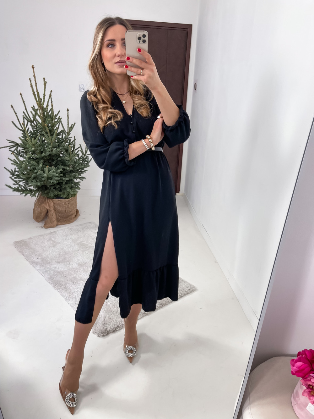 Sukienka o kroju midi z ozdobnymi odpinanymi guziczkami. W talii posiada gumkę, dzięki temu dopasuje się do każdej sylwetki. Rozmiar uniwersalny sprawdzi się u osób noszących na co dzień rozmiar XS,S oraz M.