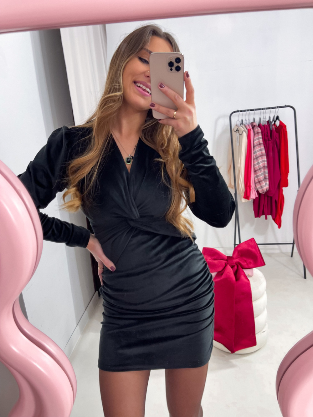Dopasowana sukienka z imitacji weluru. Sukienka posiada dekolt w kształcie litery V z ozdobnym supełkiem. Idealnie dopasuje się do sylwetki. Korzystnie wygląda u osób noszących rozmiar od XS do M. Marszczenie po bokach powoli na dopasowanie długości. Dostępna w sklepie internetowym CLARET w kilku kolorach.