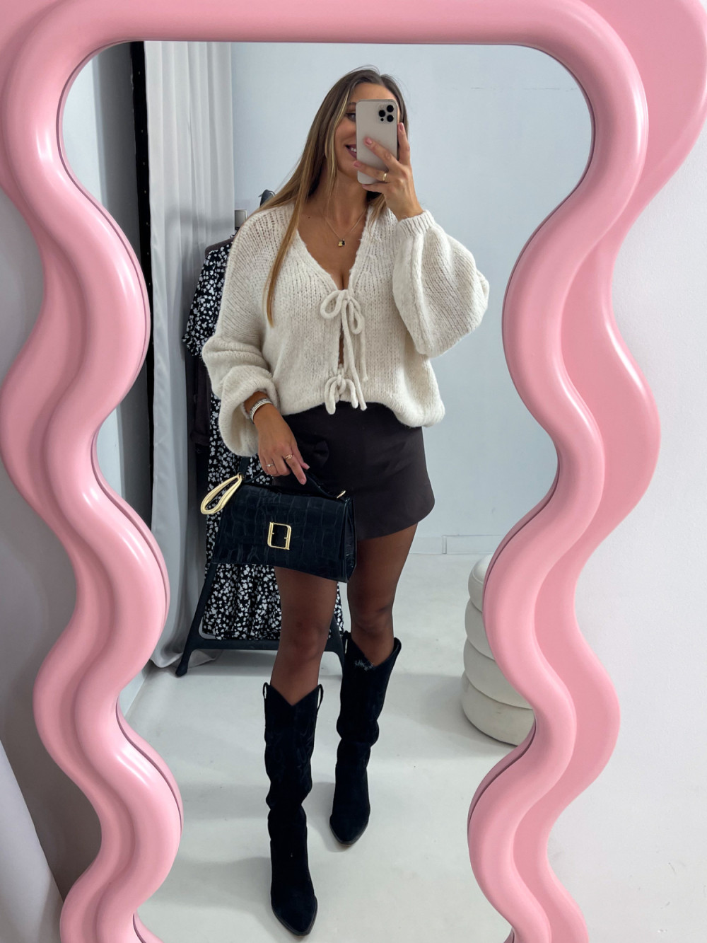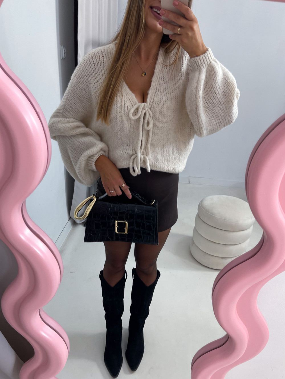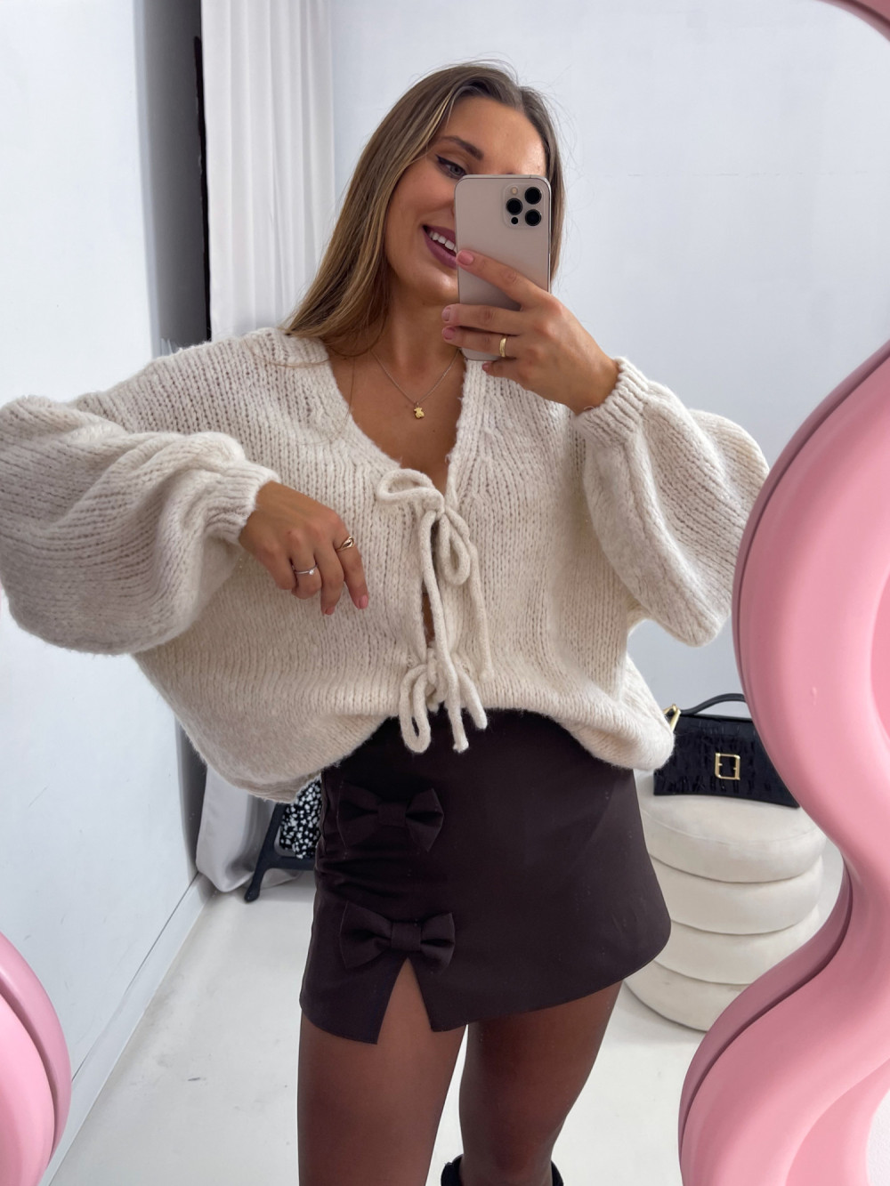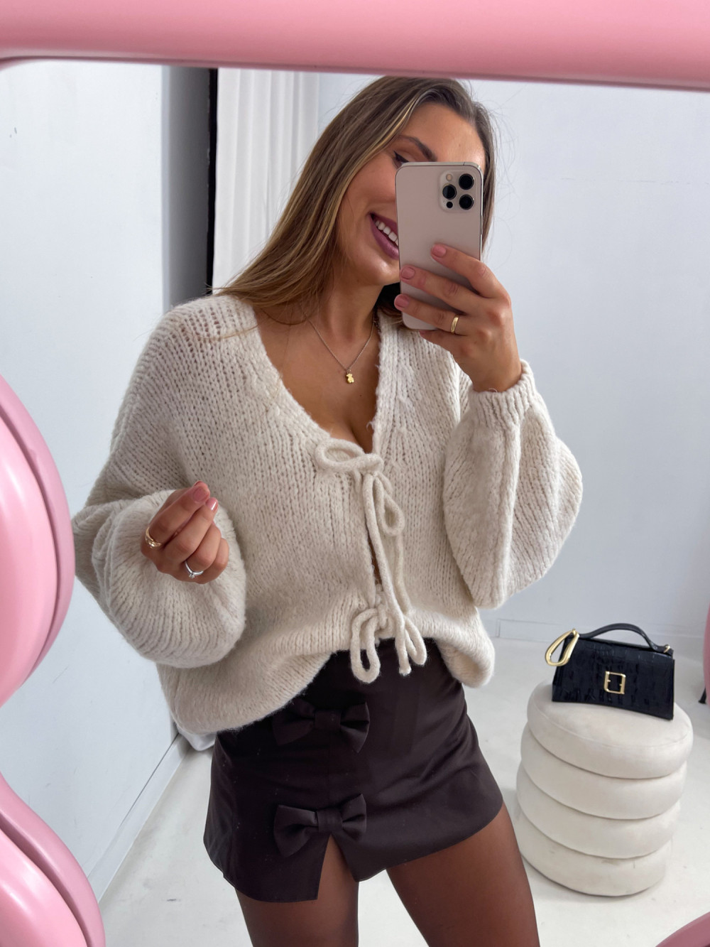 SWETEREK MICA ECRU WIĄZANY NA KOKARDKI DŁUGI RĘKAW