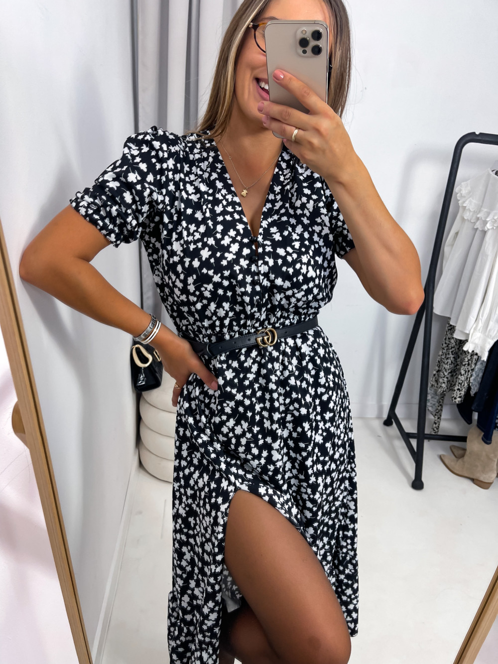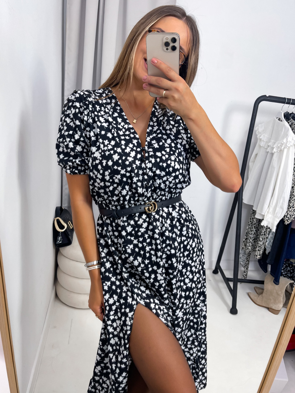 NARIA MIDI KRÓTKI RĘKAW CZARNA W DROBNE KWIATUSZKI