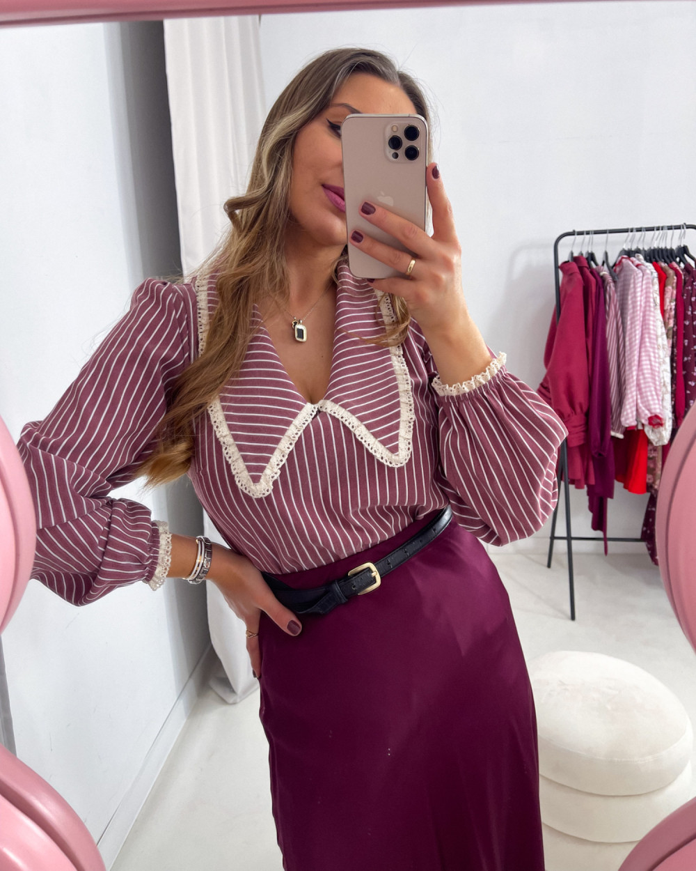 KOSZULA RITA BORDOWA W PASKI Z BEŻOWYM WYKOŃCZENIEM